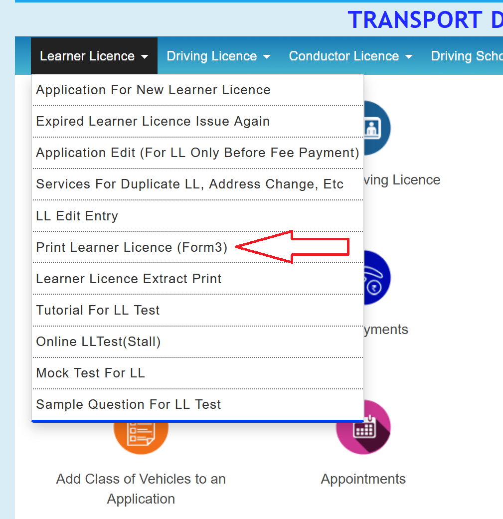Download / Print Learner's Licence: Go to Learner's Licence > Print Learner's Licence (Form 3). Enter your Application/Licence Number, Mobile Number, and Date of Birth.