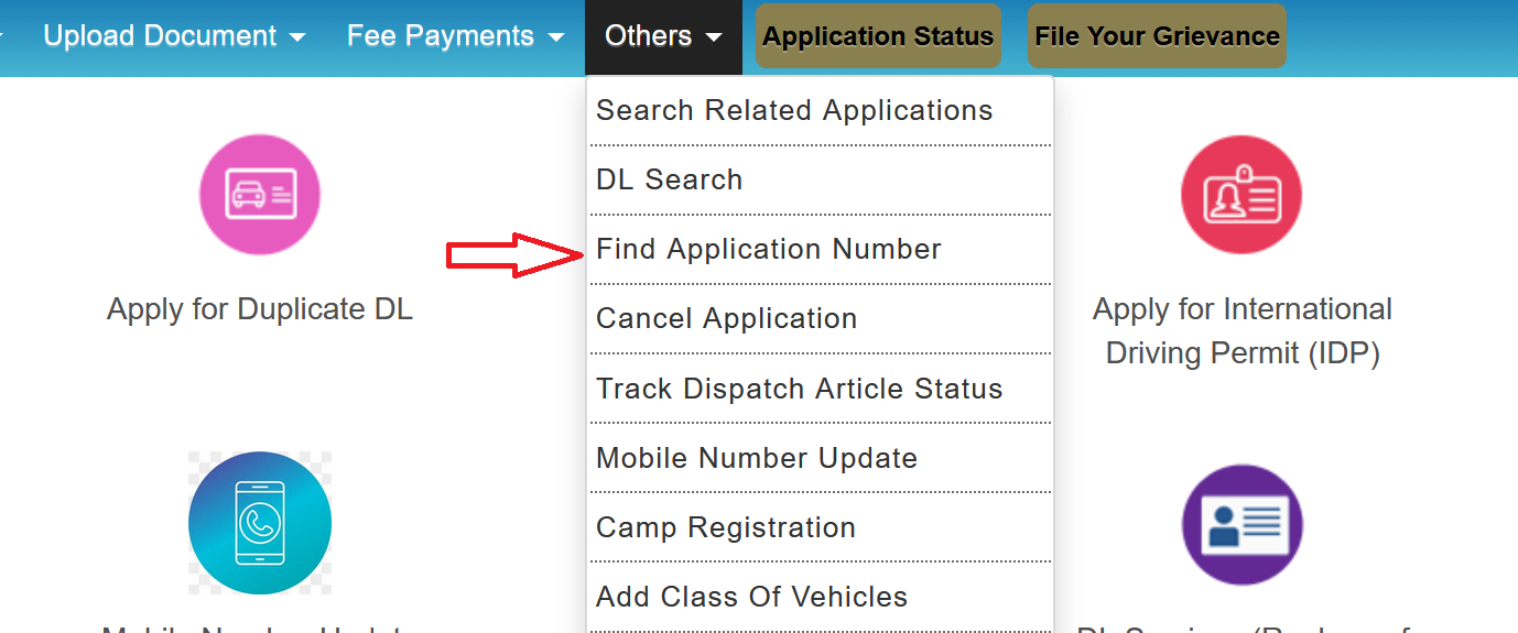 • You should see an option like "Find Application Number", "Search Related Application", or "DL Search." The exact wording changes from state to state.