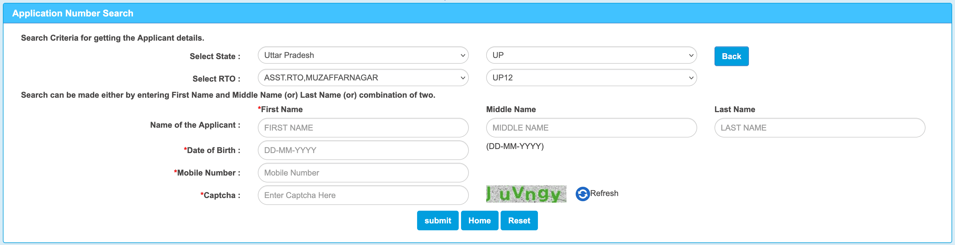 • Enter your Application Number. This is the number you received when you first submitted your DL application at the RTO or online.